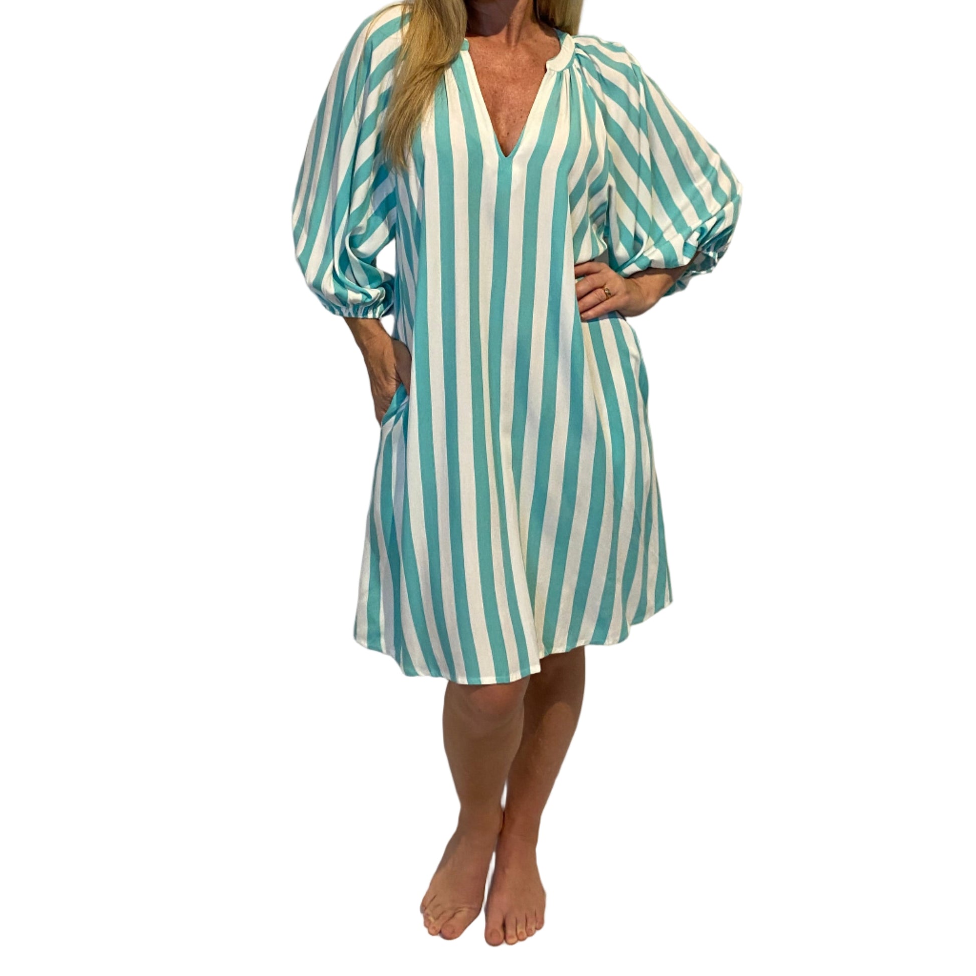 The Eb & Ive Treville Stripe Top features a flattering low-cut neckline and elegant flowy wide sleeves, designed to enhance your feminine silhouette. The aqua stripe pattern adds a unique, stylish element, making it a versatile addition to refresh your wardrobe with charm.