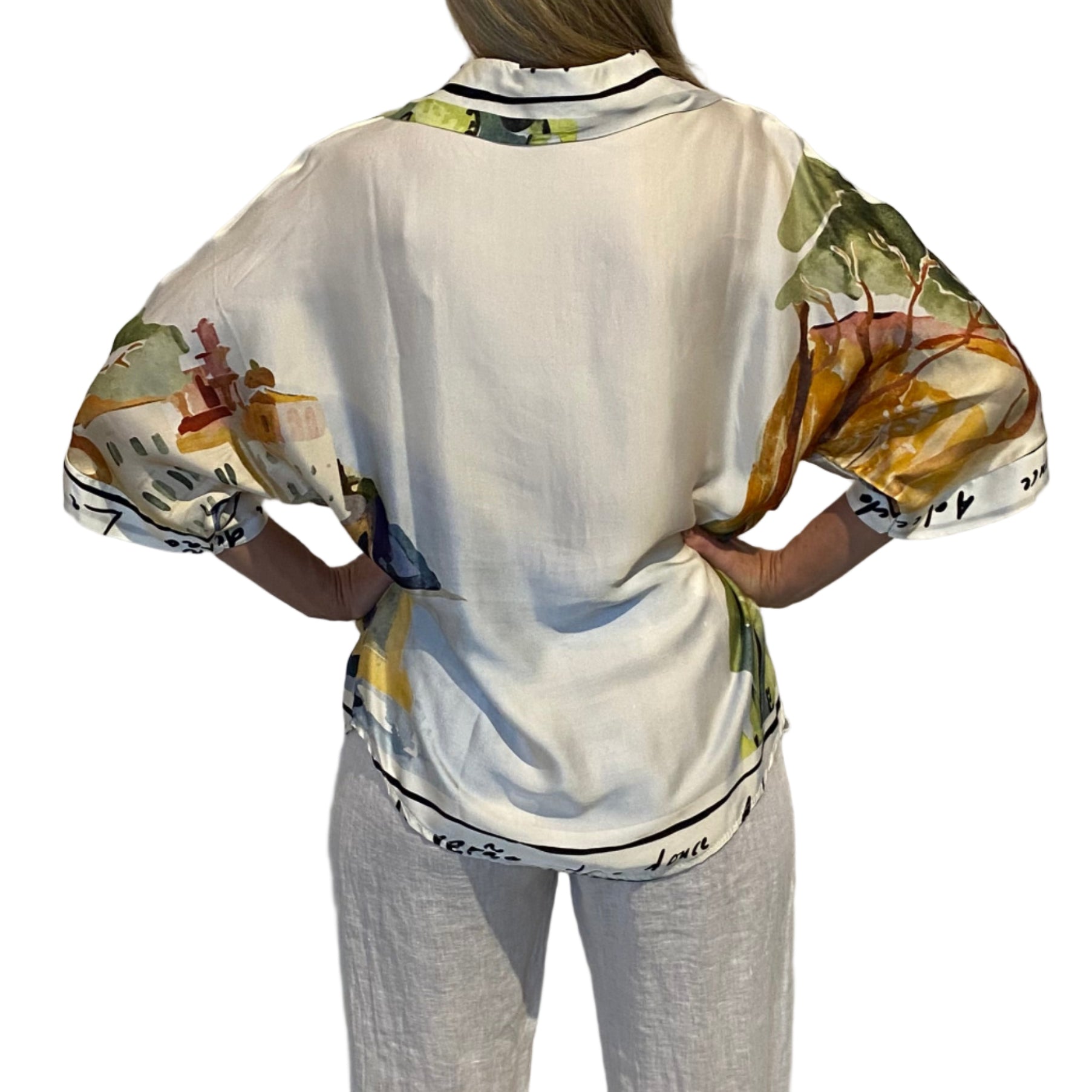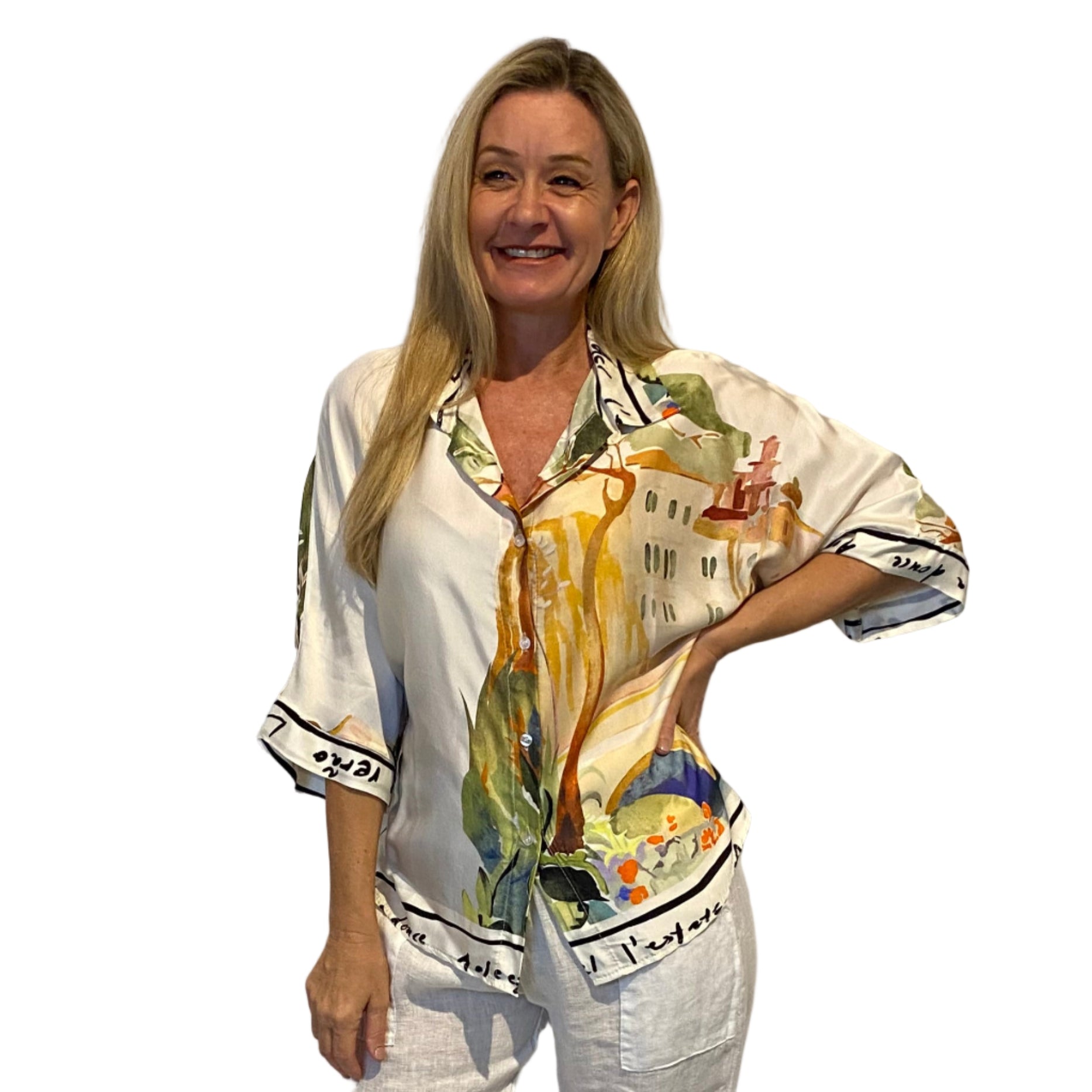 Crafted from 100% viscose with a luxurious, silky touch, this divine collared button up shirt offers a fluid, flattering drape that moves effortlessly with you. Pair them with our matching pant or a soft linen top for an effortlessly chic look. Featuring the standout Amalfi Coast print, this are a true statement piece in any wardrobe.