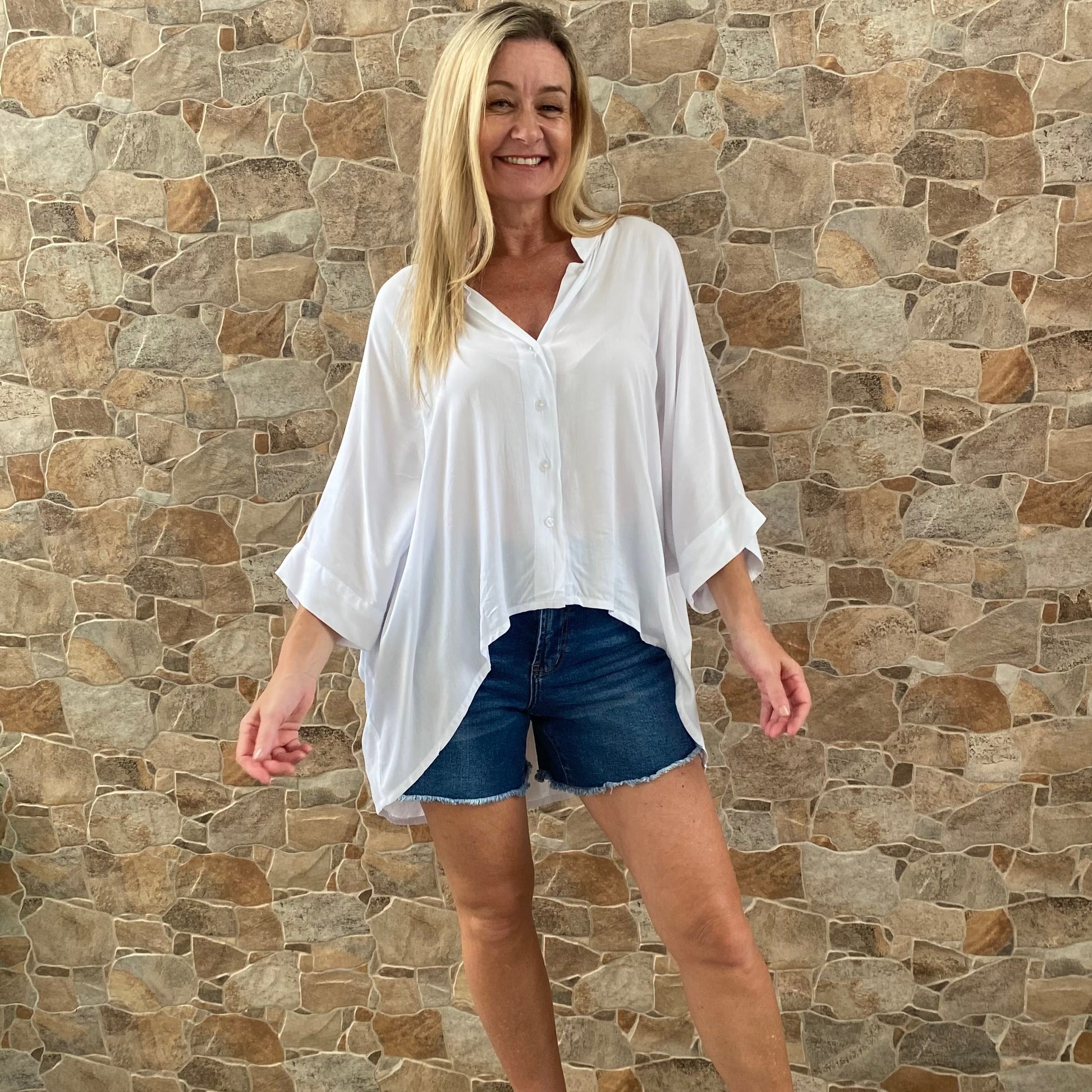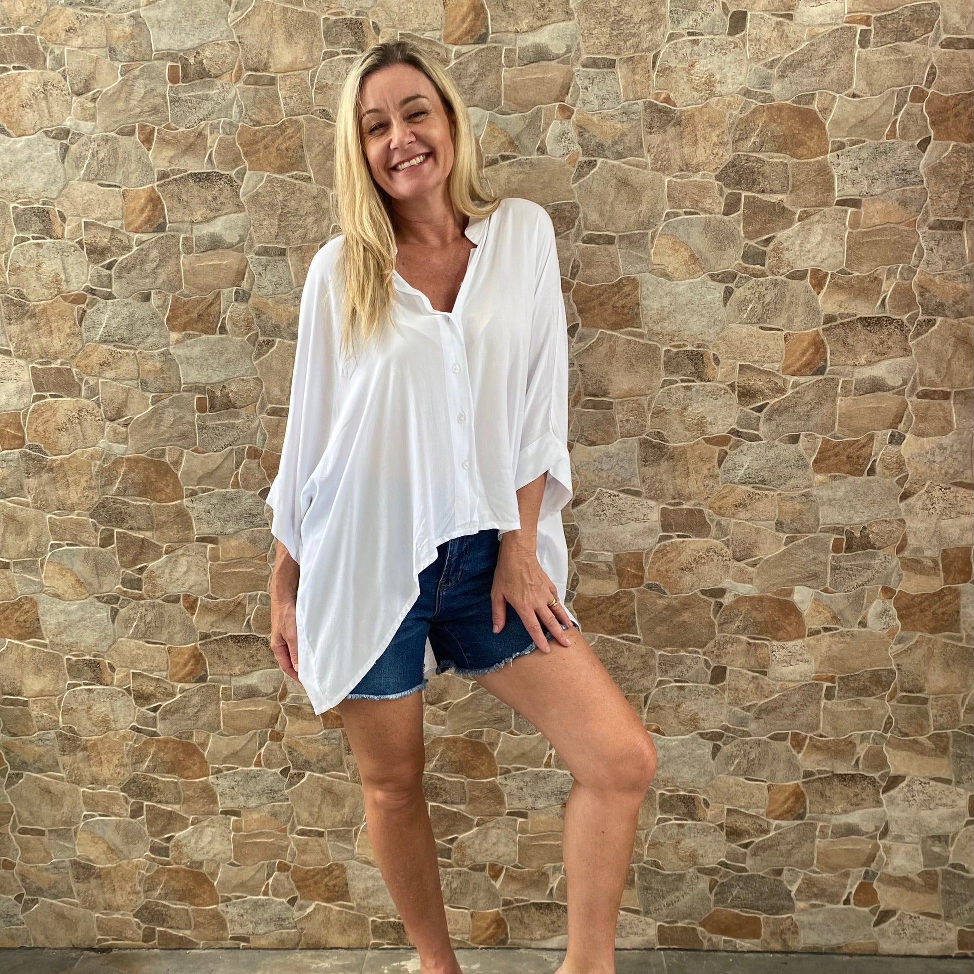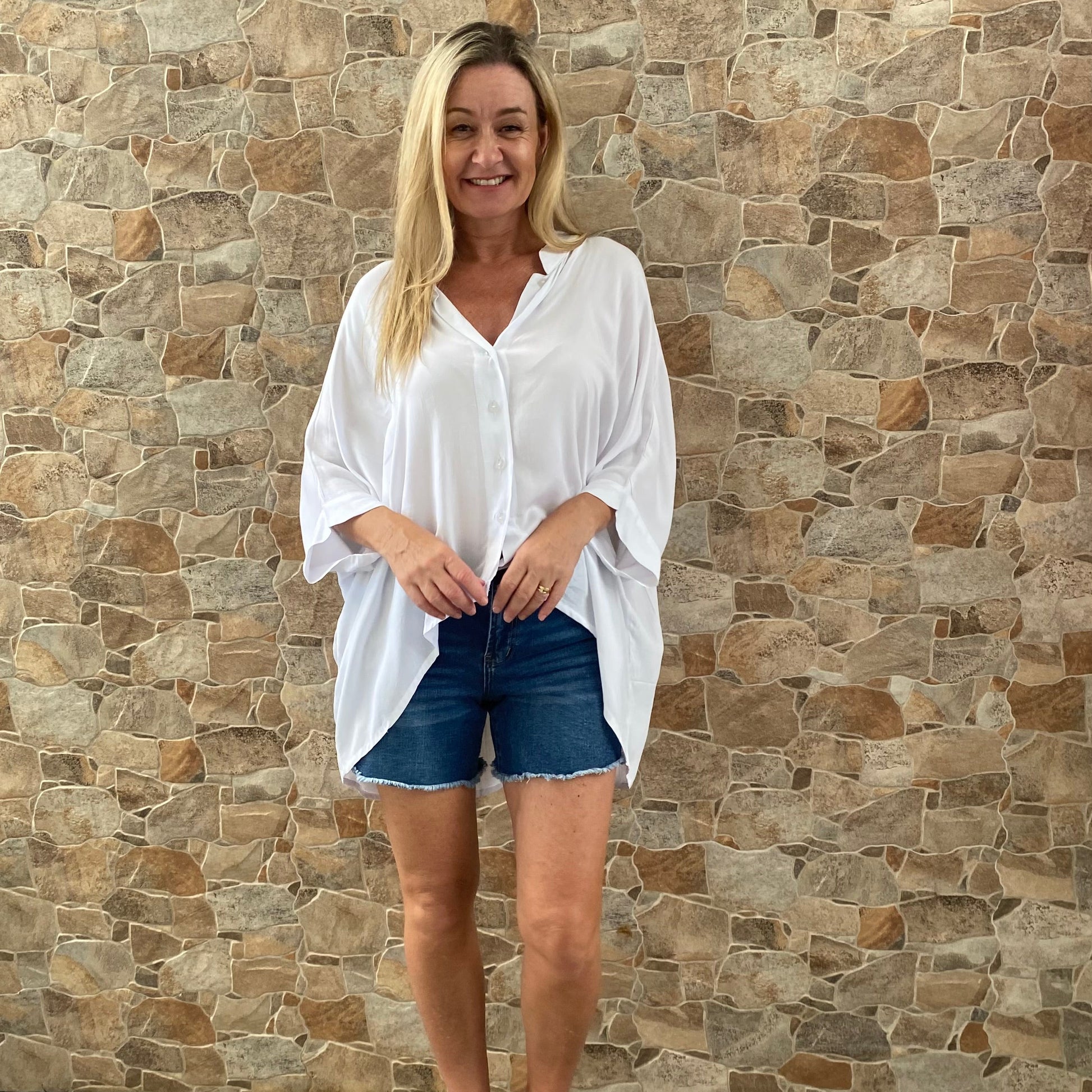 The perfect addition to your warm-weather wardrobe. Made with an oversized fit and designed with a mandarin collar, this shirt is shorter at the front and longer at the back for a stylish and modern look. Perfect for layering over swimwear or pairing with casual pants. Upgrade your summer style today!