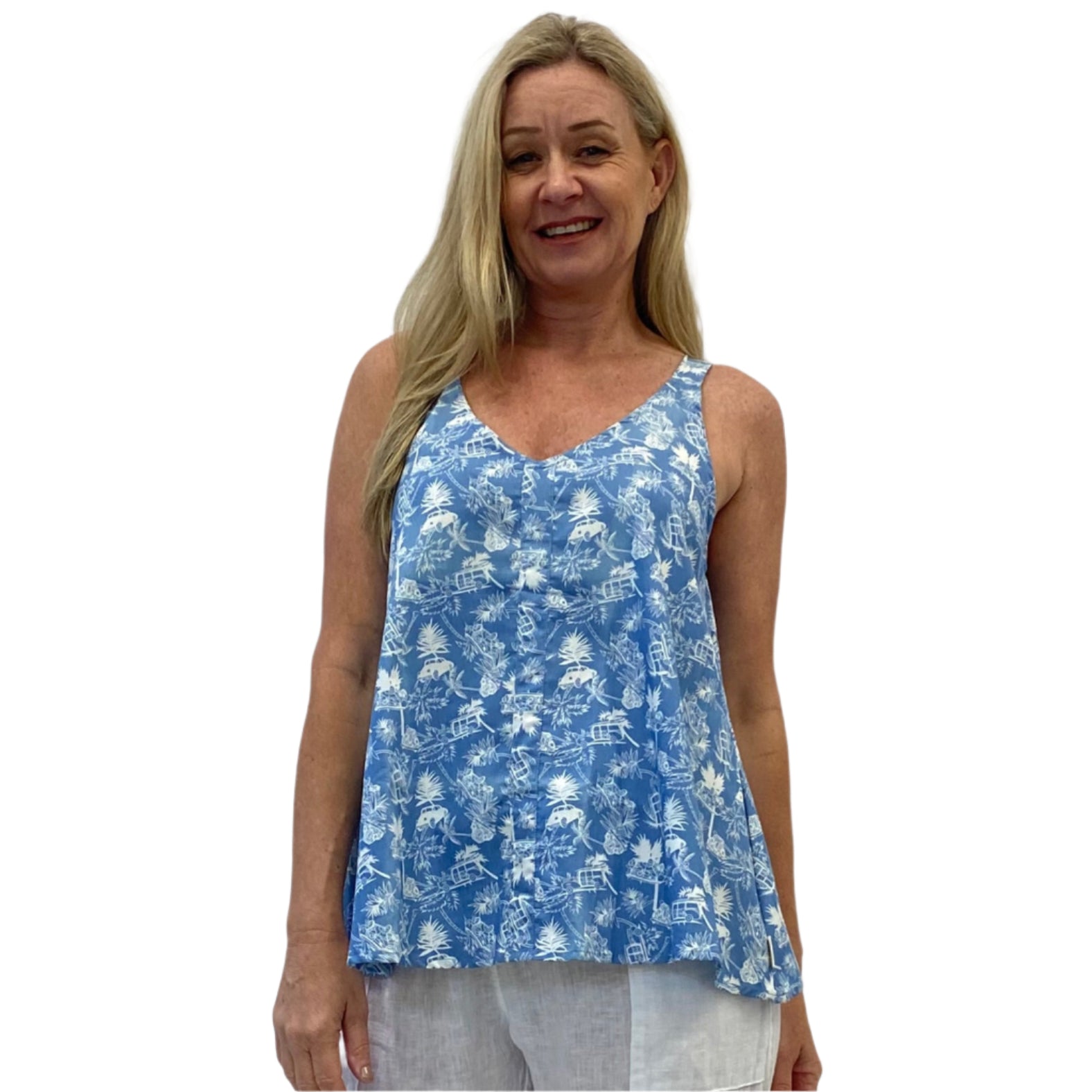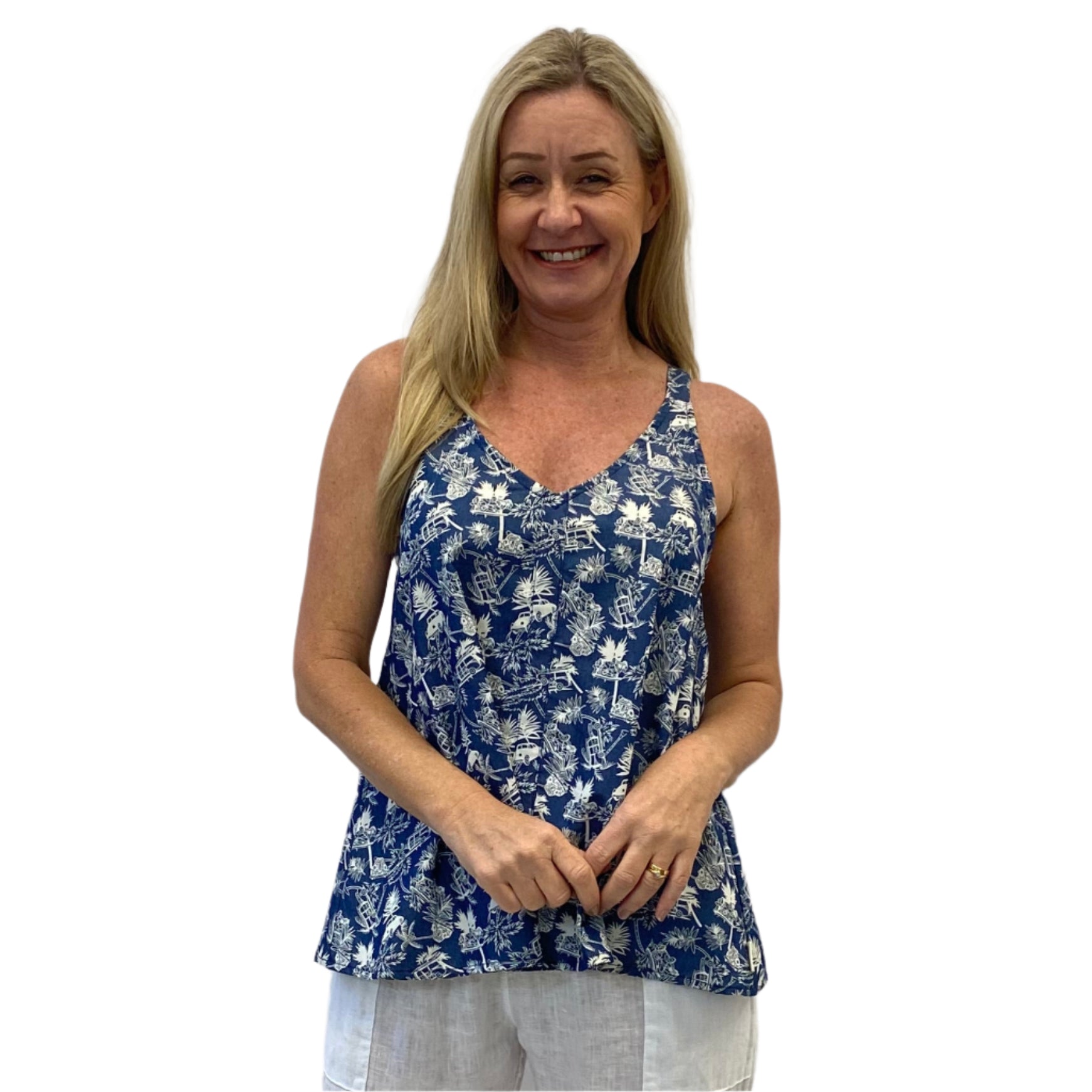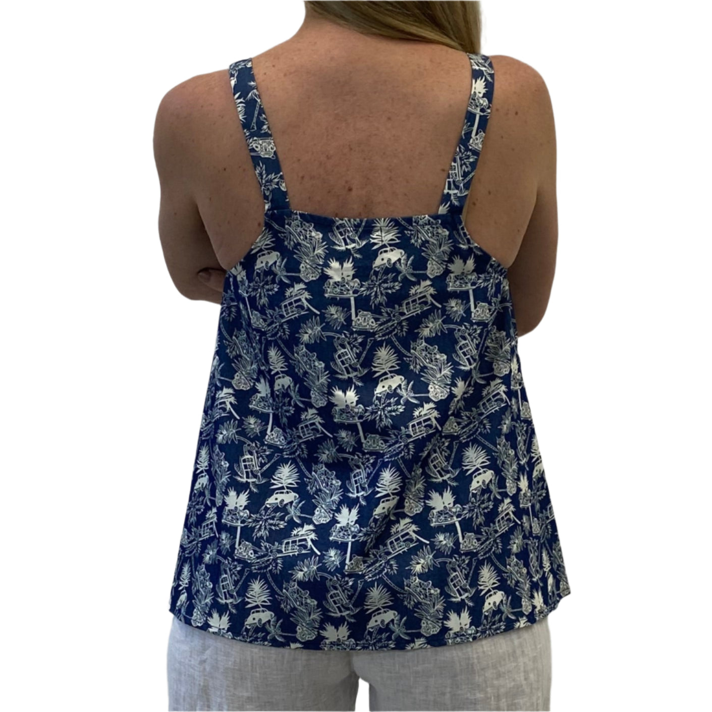 This season has our swing singlet silhouette, now in a fun summer paradise print. Made from light, breathable cotton, it features wide straps so you can comfortably wear a bra underneath, and a relaxed swing shape that flatters while offering just the right amount of coverage. Effortless, easy, and made for warm days.
